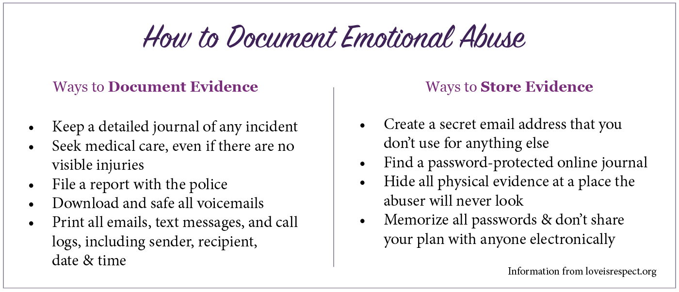 - Documentation– This is key. If you think you may find yourself in a court case someday or to simply remind yourself of what the abuser has said or done in the past. Keep written logs, take screenshots, keep voicemails, etc. Some apps can help with this!